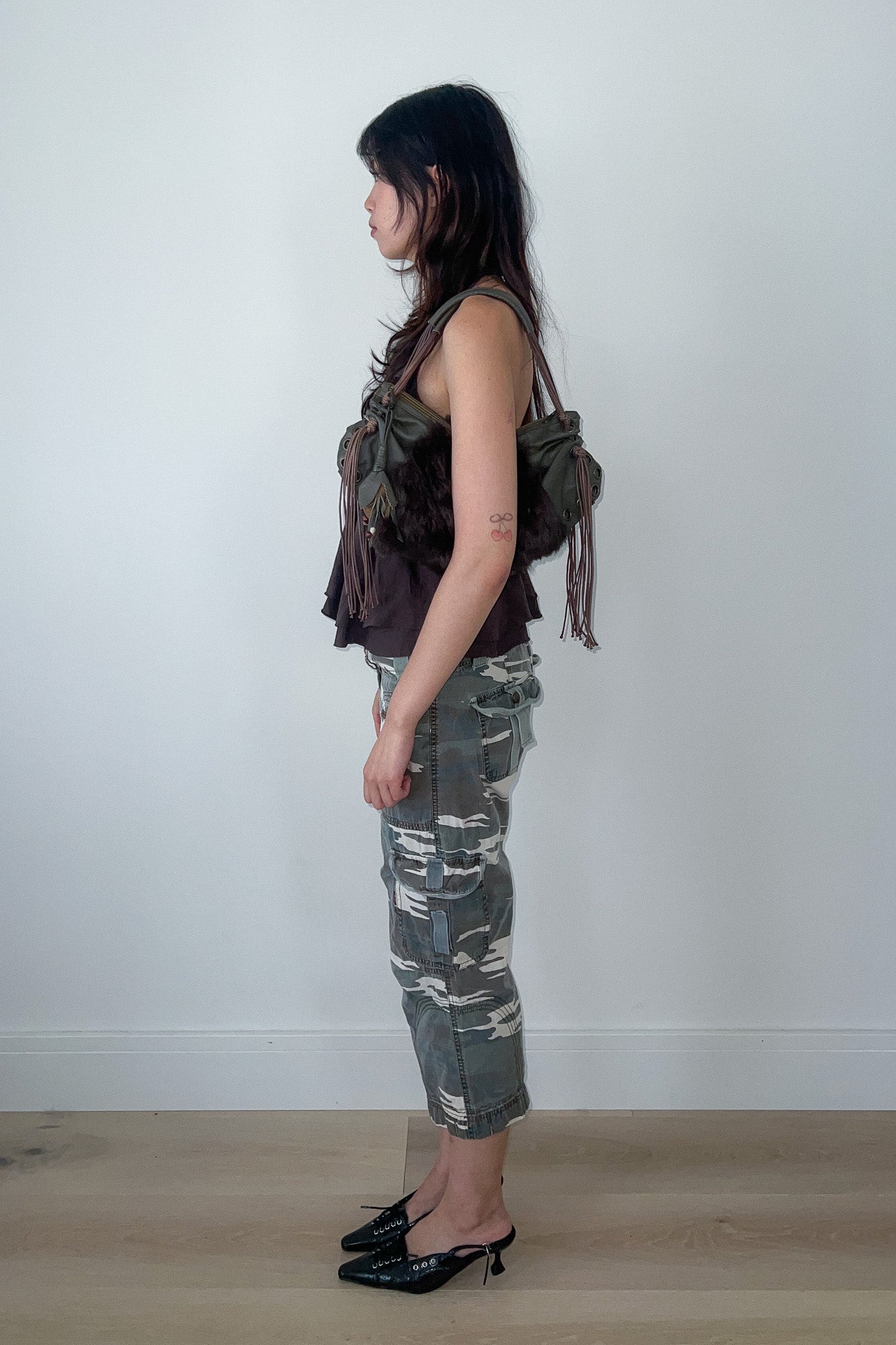 vintage ray beams fur and leather tassel bag featuring adjustable multi-tassel straps and the cutest matching keychain with pompoms.