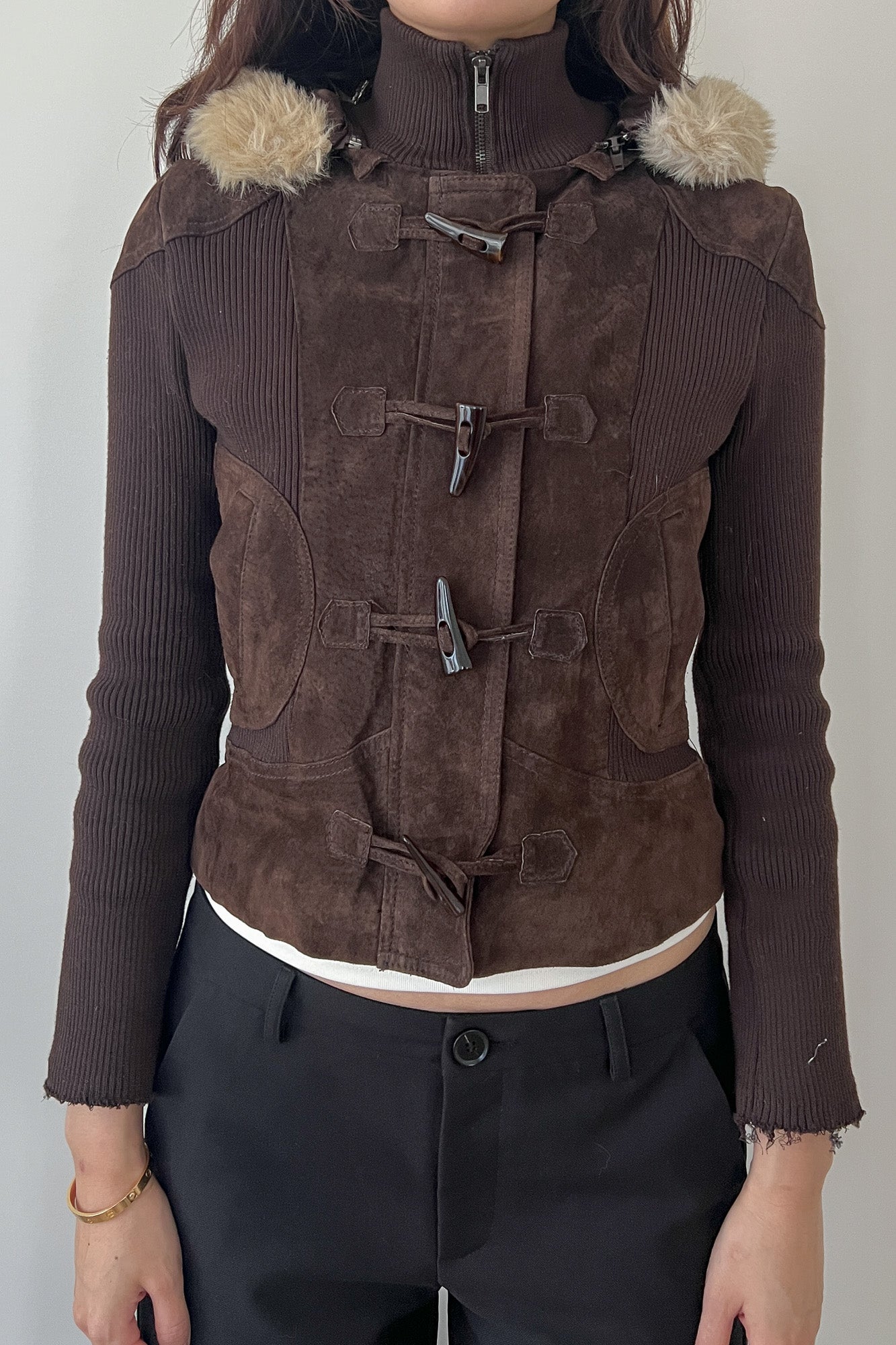 brown jacket with fur hood and toggle clasp closure.